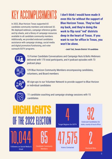 View our 2022 Annual Report for an overview of how, in our inaugural year, Blue Horizon Texas has grown into a successful, multi-entity enterprise with a growing reputation among Democratic and progressive groups across the state.